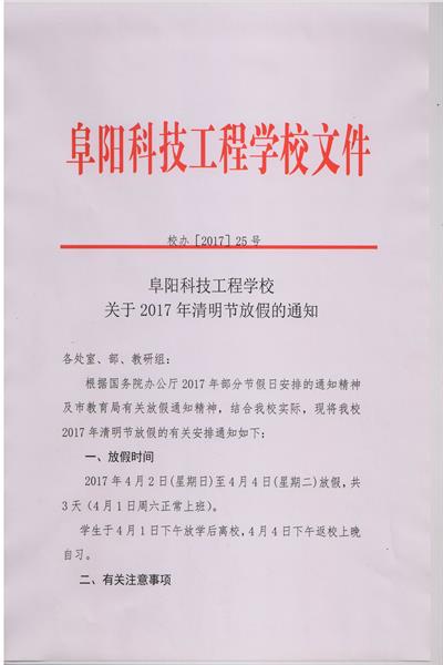 阜阳科技工程学校关于2017年清明节放假的通知
