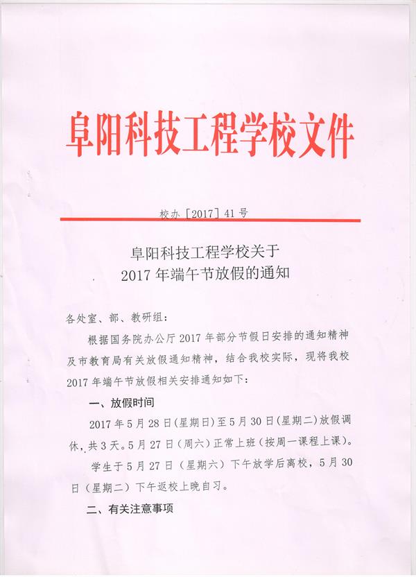 阜阳科技工程学校关于2017年端午节放假的通知