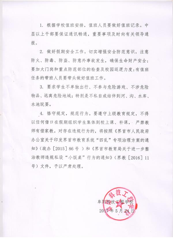 阜阳科技工程学校关于2017年五一国际劳动节放假的通知