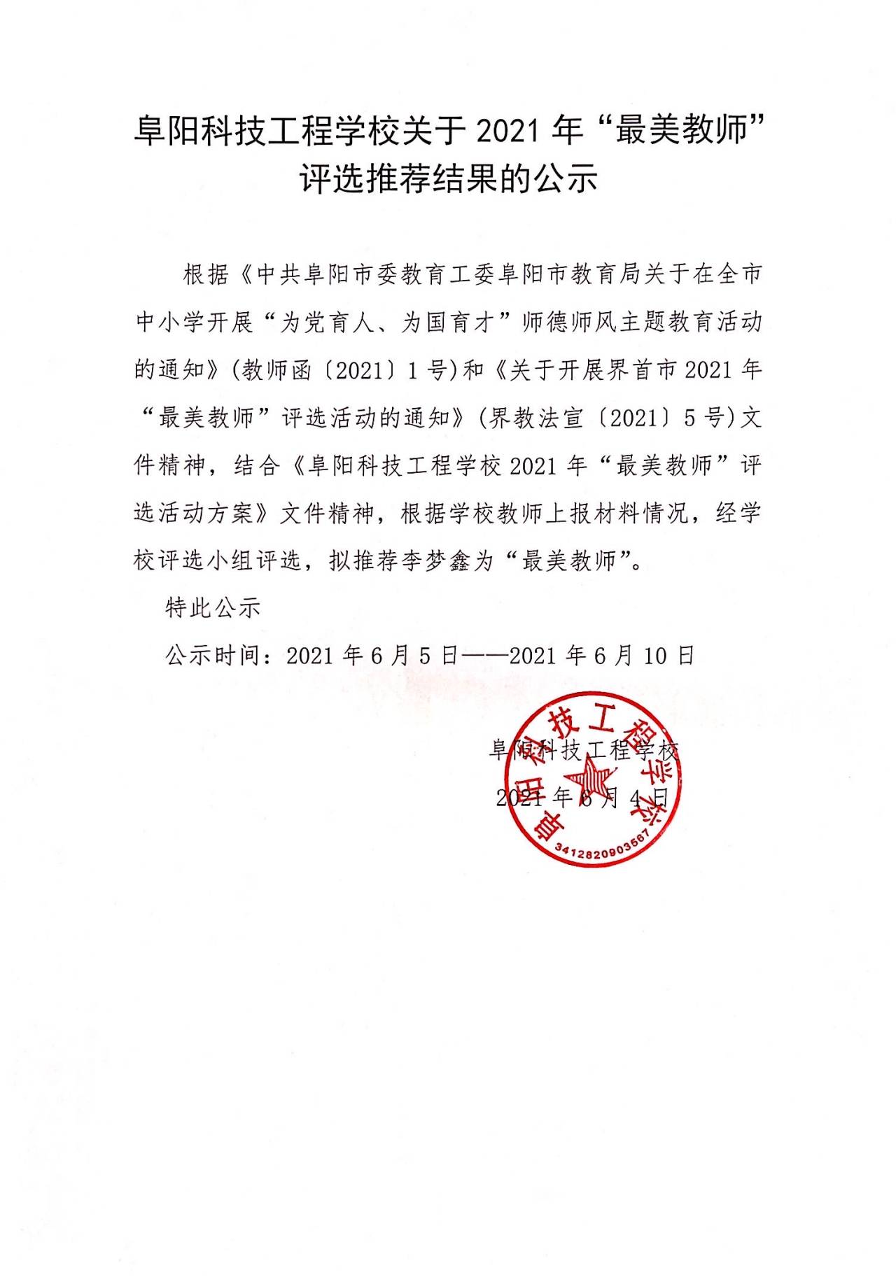 阜阳科技工程学校关于2021年”最美教师”评选推荐结果的公示