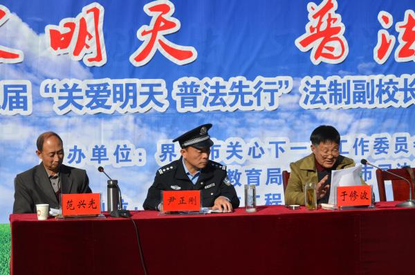 10月27日下午,界首市第三届“关爱明天 普法先行”法制副校长、辅导员现场培训会在阜阳科技工程学校举行。界首市关工委主任于修波、界首市公安局副局长尹正刚、市妇联副主席曹兰芳等参加培训会。
