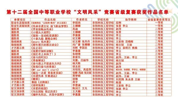 第十二届全国中职学校文明风采大赛安徽省级复赛评比结果近日揭晓,阜阳科技工程学校共获得省级一等奖2个,二等奖7个,三等奖15个,省级优秀辅导教师3人,获奖率70.5%,高于全省平均获奖率60.3%10个百分点,为历年来该项比赛的最好成绩。