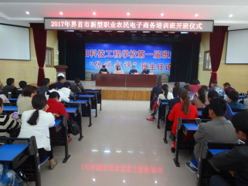 2017年4月29日上午,界首市新型职业农民农村电商人才培训班在阜阳科技工程学校笃行楼五楼报告厅举行了开班仪式。标志着界首市2017年新型职业农民电商人才培训正式拉开序幕。来自界首市各乡镇街道办事处的农业企业、农民合作社、家庭农场中从事电商人员、农村中青年创业人员等共220人参加了开班仪式。
