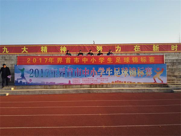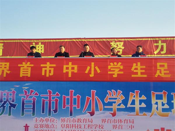 11月25日,橙黄橘绿,暖阳高照,界首市2017年中小学生足球锦标赛在阜阳科技工程学校拉开了序幕。界首市体育局局长肖坤山、教育局局长梁志、副局长孙景海等有关同志以及来自全市各学校的24支代表队参加了开幕式。