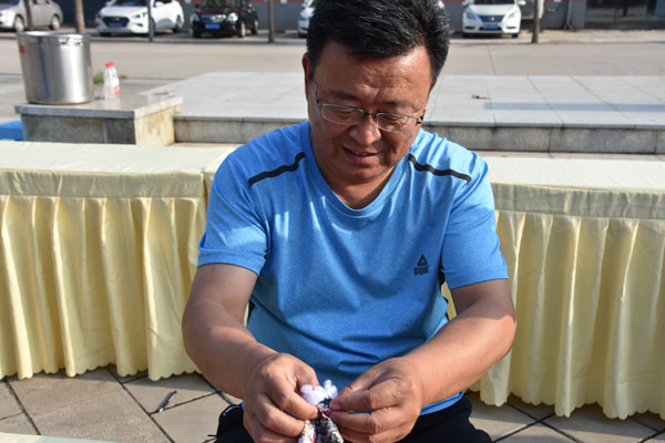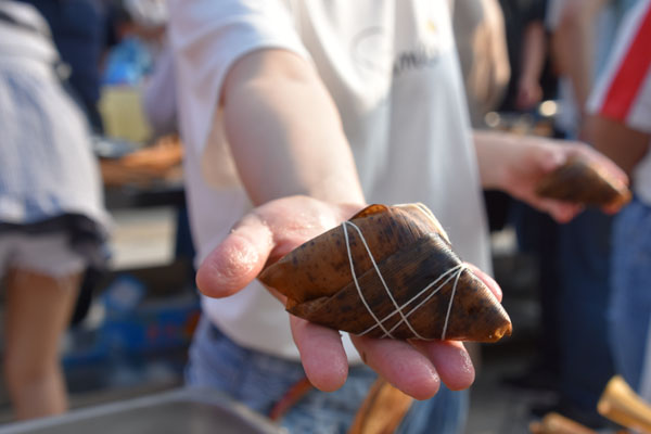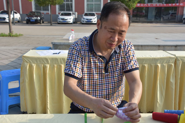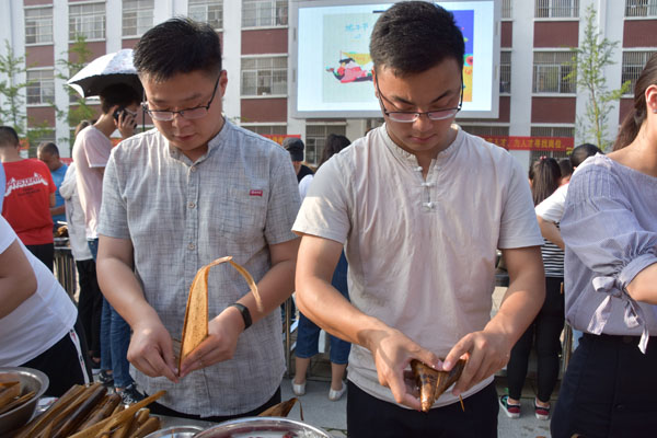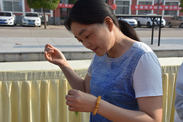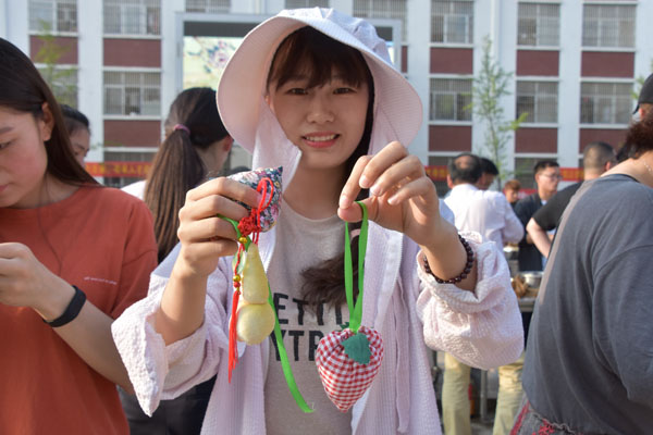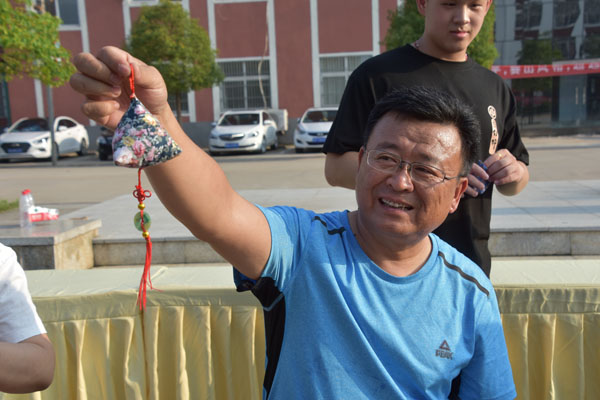 活动现场热闹非凡,大家摩拳擦掌,跃跃欲试。刺绣区,条桌上堆满了做香包的各种布料、花边、丝带以及中草药香料等。女老师们串珠、缝制、填充棉花和中药,不一会儿,一个个五颜六色、形状各异的香包就呈现在大家的面前:菱角包、葫芦包、草莓包……样式丰富,做工精美。几位男老师不让巾帼,加入了缝制香包的队伍,穿针引线,有模有样动作娴熟,不输巾帼,赢来现场观众阵阵喝彩……包粽区热火朝天,只见一双双巧手上下翻飞,捋粽叶、填糯米、压紧实、封口、扎捆……一眨眼,形态各异的粽子迅速展现在大家面前,艾香、粽香、掌声在空气中弥漫开来,现场一片欢声笑语。
