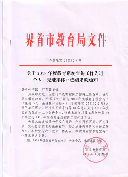 界首市教育局召开德育与宣传工作现场会,我校屡获嘉奖。
