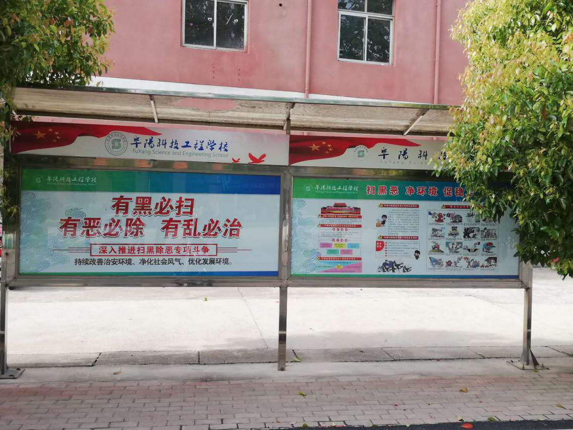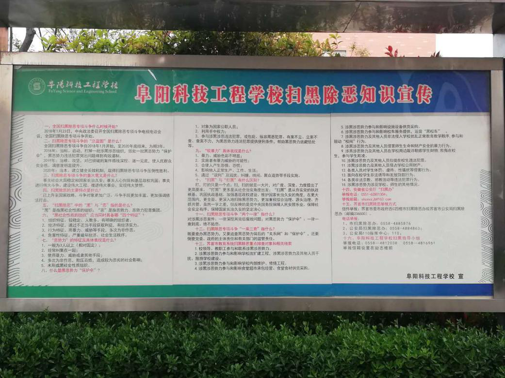 利用电子屏循环播放扫黑除恶的宣传片,出一期有关扫黑除恶宣传橱窗。发放阜阳科技工程学校扫黑除恶《致家长朋友的一封信》。学校利用周一晨会的时间,进行国旗下讲话,大力宣传宪法、刑法、治安管理处罚法等法律,提高师生、群众依法同黑恶势力斗争的认识和能力,激发全体师生及群众同黑恶势力作斗争的决心和勇气,震慑黑恶势力的犯罪行为。学校还开展了排查整治学生携带管制器械进校园和拉帮结派欺凌学生的现象,净化了学校的环境,保证了教育教学的顺利进行。