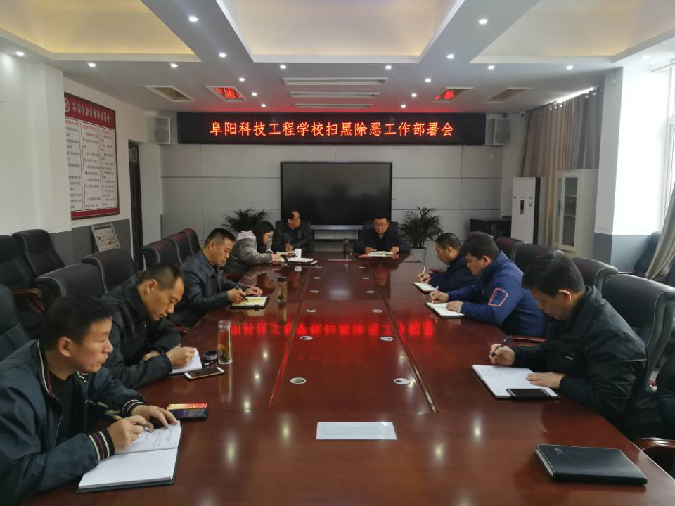 学校成立了以于洪波校长为组长,穆达书记为副组长,各处室负责人及各班班主任为组员的领导小组。学校建立了扫黑除恶侵害案件信息报告制度。在全体班主任例会上,传达了《界首市教育局扫黑除恶专项斗争工作方案》通知精神,并宣读了《阜阳科技工程学校扫黑除恶专项斗争工作实施方案》。