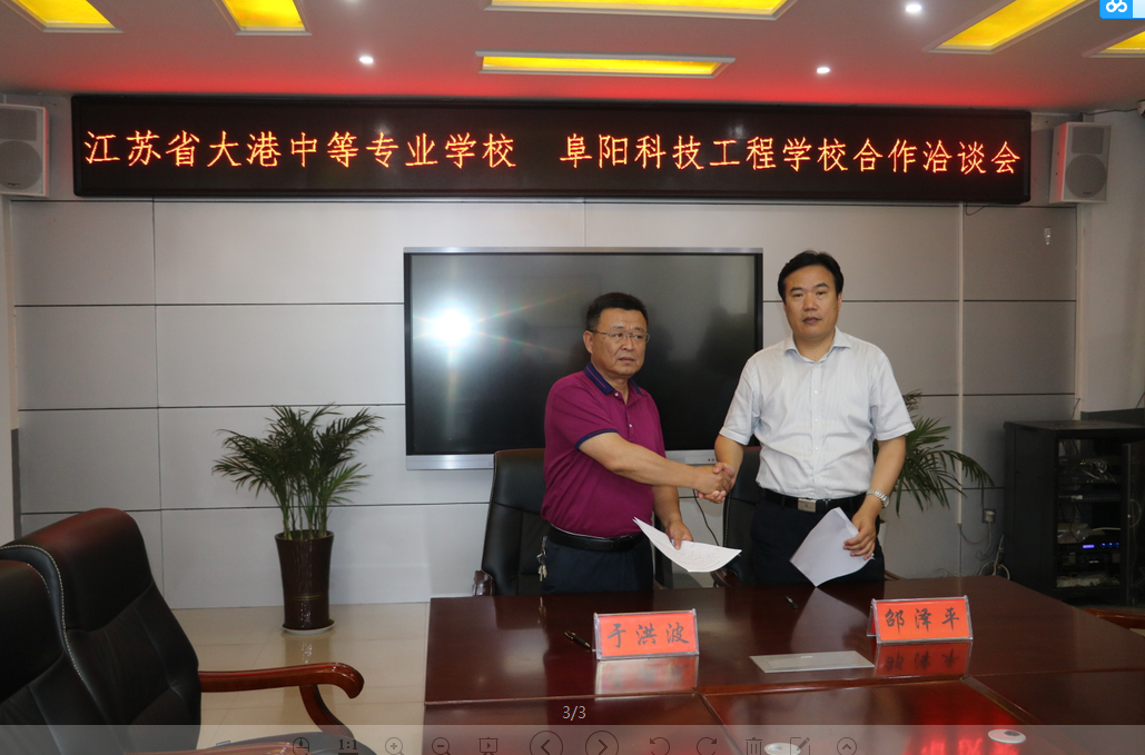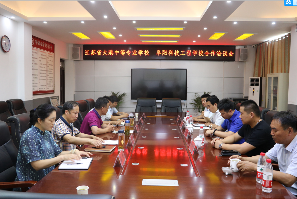 2019年6月22日,阜阳科技工程学校与江苏省大港中等专业学校校校合作洽谈会在阜阳科技工程学校四楼会议室举行。阜阳科技工程学校校长于洪波、副校长张立、督学王立华、工会主席张晋、教务处主任张军,江苏省大港中等专业学校党委书记兼校长邵泽平、副校长李承文,教师代表王顺子、李辉参加了此次洽谈会。