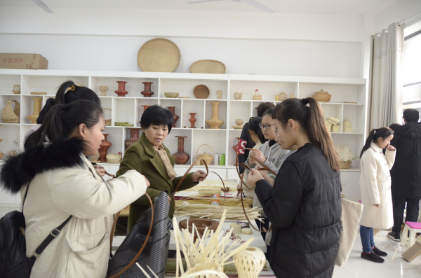 在学校非遗教育传习基地,负责人张晋介绍了学校非遗社团及社会培训方面的工作开展情况。师生们观看了竹编、剪纸、彩陶以及渔鼓等社团的活动情况,大家被传承人精湛的技艺所震撼,为他们的工匠精神喝彩。