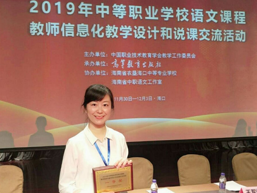全国中等职业学校语文课程教师信息化教学设计与说课交流活动于 12月1日至3日在??诰傩?,阜阳科技工程学校教师张娟在现场说课和教学能力展示两个环节中,创新课堂教学方法,突出职业教育特点,凭借扎实的教学基本功和出色的现场表现赢得了评委的认可,最终荣获一等奖,这是阜阳科技工程学校在教师教学技能方面取得的又一突破。