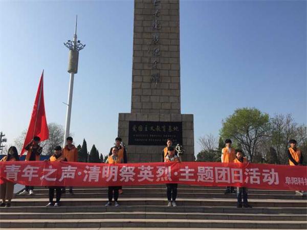 4月2日,阜阳科技工程学校组织红绿蓝志愿者到界首市爱国主义教育基地“七七抗战纪念碑”开展“清明祭英烈”主题团日活动。