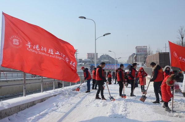 因界光路段内有一座铁路涵洞,涵洞上下坡道积雪紧实,极易引发交通事故,阜阳科技工程学校教职工分组轮换,交替铲除涵洞通道内积雪,受到来往群众的赞誉。