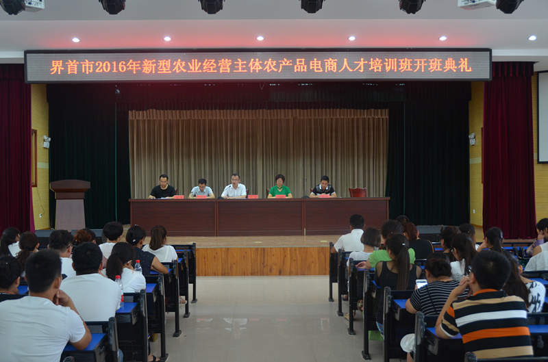 2016年新型农业经营主体农产品电商人才培训班开班 7月27日,界首市2016年新型农业经营主体农产品电商人才培训班在阜阳科技工程学校实训楼五楼报告厅隆重开班。界首市农委农科教股股长年丽婷、农科教股副股长郭文华、阜阳科技工程学校校长闫锋、培训处主任段刚、 省电子商务讲师团专家安徽科技学院副教授张宝国等共同出席开班仪式。来自全市种养大户、家庭农场、农民合作社、复员军人、返乡农民工等110名培训人员参加了开班典礼。