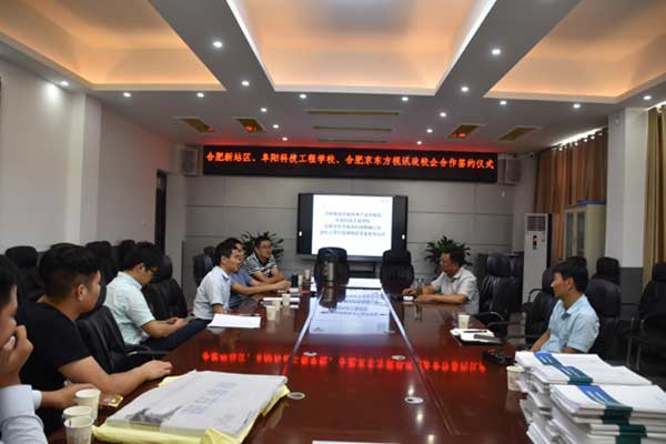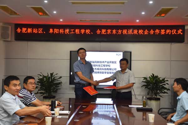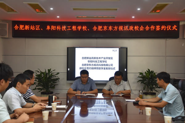 随后在热烈的气氛中,阜阳科技工程学校分别与合肥新站高新技术产业开发区、合肥京东方视讯科技有限公司签订了政校企合作协议。