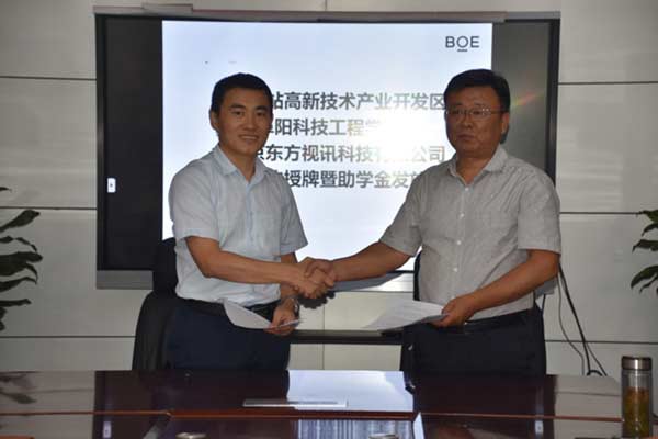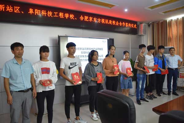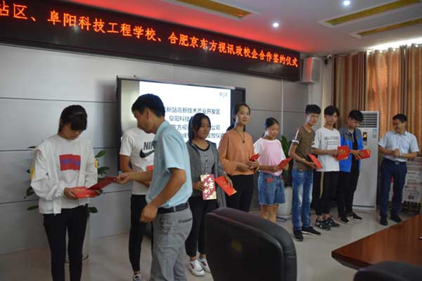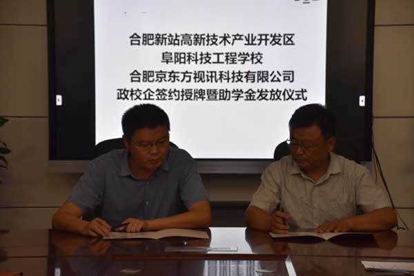 9月7日下午,合肥新站高新技术产业开发区、阜阳科技工程学校、合肥京东方视讯科技有限公司政校企签约授牌暨助学金发放仪式,在阜阳科技工程学校举行。