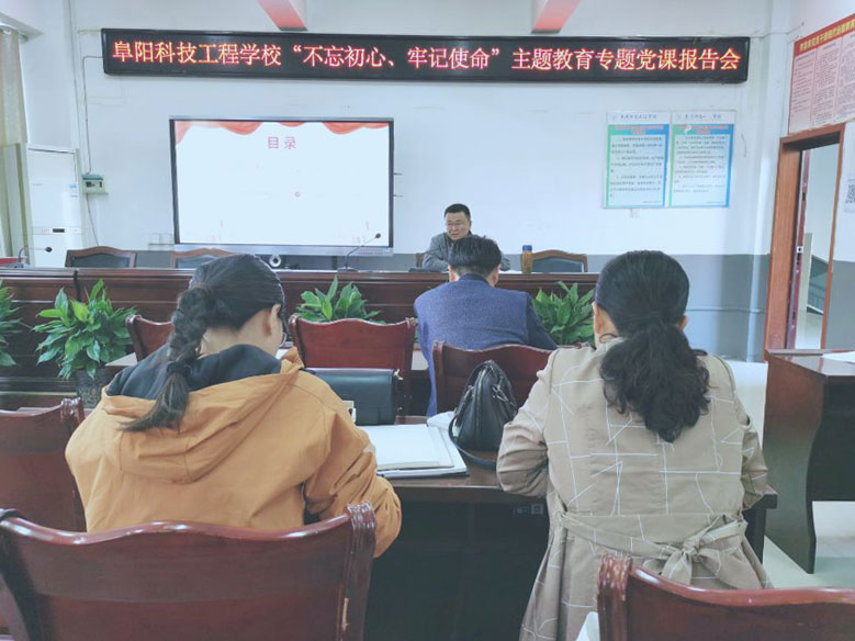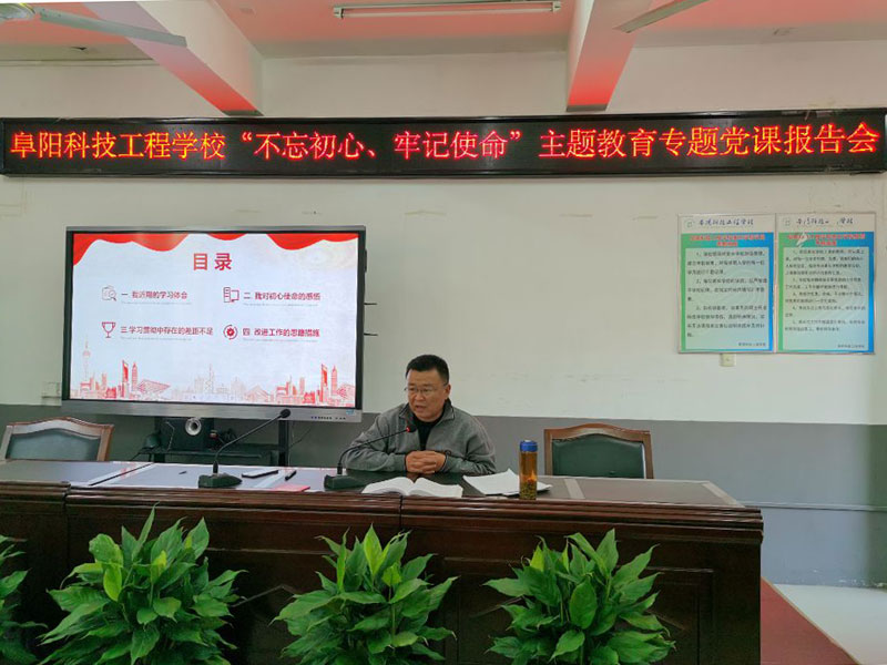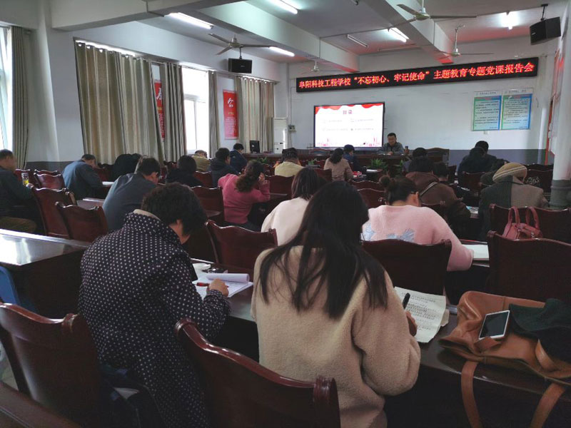 11月10日下午,阜阳科技工程学校在笃行楼四楼举行“不忘初心、牢记使命”主题教育专题党课报告会。校长于洪波为全校党员、中层干部上了一堂“不忘初心、牢记使命,永远奋斗”专题党课。